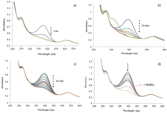 Catalytic reduction reactions were performed in a standard 3 mL quartz cuvette with a 1 cm path length. The UV–vis absorbance spectra were recorded in the 200–700 nm range at 2 min intervals. A shift of the corresponding absorbance peak at 315 nm to 400 nm occurred immediately after the addition of NaBH4. This new peak (at 400 nm) is attributed [27,28,29,30,31,32] to the 4-nitrophenolate ion formed in the presence of NaBH4.