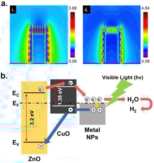 - Zhou, G.; Xu, X.; Ding, T.; Feng, B.; Bao, Z.; Hu, J. Well–steered charge–carrier transfer in 3D branched CuXo/ZnO@Au heterostructures for efficient photocatalytic hydrogen evolution. ACS Appl. Mater. Interfaces 2015, 7, 26819–26827. [Google Scholar] [CrossRef] [PubMed]