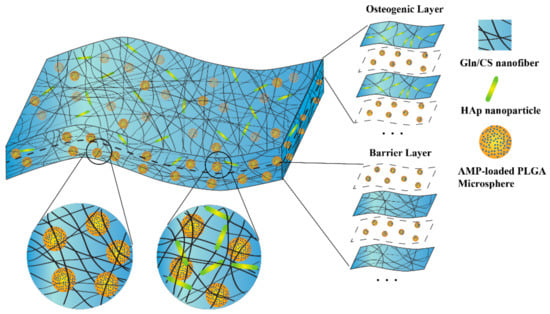 Schematic diagram of the fabrication process and structure of the AMP@PLGA-MS@Gln/CS/nHAp composite membrane by sequential layer-by-layer electrospinning and electrospraying. This biodegradable membrane consists of two layers: the barrier layer (Gln/CS nanofibers) and osteogenic layer (Gln/CS/nHAp nanofibers). The AMP-loaded PLGA microspheres were electrosprayed alternately during the electrospinning, and were therefore embedded within the membrane.