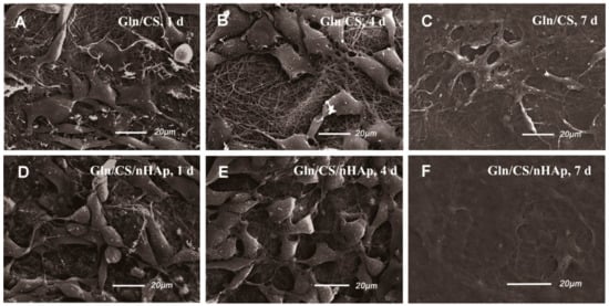 SEM micrographs of rBMSCs seeded on the barrier layer (A–C) and osteogenic layer (D–F) of the Gln/CS composite membrane after 1 d, 4 d, and 7 d of cell culture.