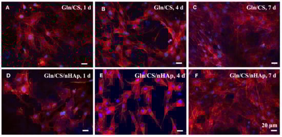 The morphological examination of in vitro cultured rBMSCs on all the membranes were performed after 1, 4, and 7 days of cell culture using SEM and confocal laser scanning microscopy (CLSM). The samples for SEM were prepared as previously indicated in Section 2.2.2. For CLSM (IX-71, Olympus Co., Ltd., Shinjuku, Tokyo, Japan) exanimation, the cells were fixed with 4% paraformaldehyde for 15 min, permeabilized with 0.1% Triton X-100 for 5 min at room temperature, and then stained with 4′,6-diamidine-2′-phenylindole dihydrochloride (DAPI) (Sigma-Aldrich Co., LLC., Rockville, MD, USA) for nucleus and Alexa Fluor 546 phalloidin (Invitrogen, CA, USA) for F-actin.