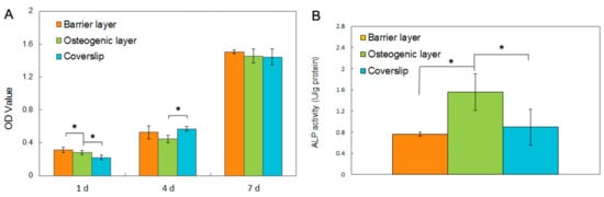 Cell behaviors of rBMSCs cultured on the Gln/CS composite membrane. (A) Cell proliferation on the barrier layer, osteogenic layer and coverslip control by CCK-8 assay; (B) Osteogenic differentiation of rBMSCs on the barrier layer, osteogenic layer and coverslip control by ALPase activity assay. * p < 0.05.