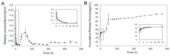 In vitro release profile of Pac-525 from the Gln/CS composite membrane. (A) The concentration of released Pac-525; (B) Cumulative release percentage of Pac-525.