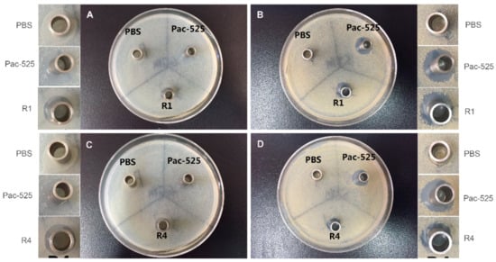 The typical morphologies of the inhibition zone induced by the elution solutions of AMP@PLGA-MS@Gln/CS/nHAp composite membrane at the first week (A,B) and the fourth week (C,D) against E. coli (A,C) and S. aureus (C,D) after 3 days of incubation on agar plate.