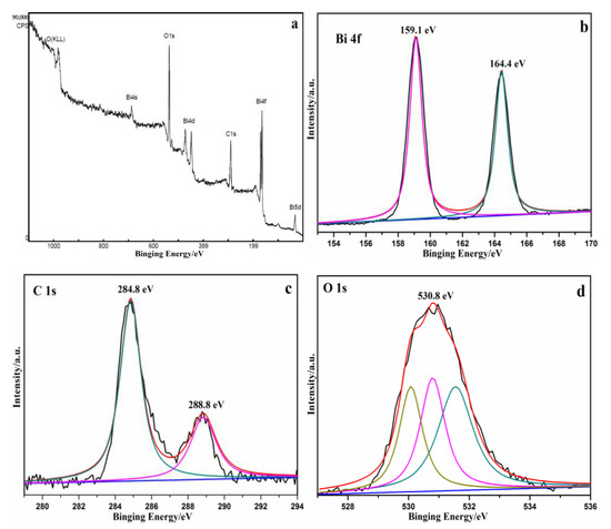 The surface properties and chemical compositions of the samples could be determined by using an X-ray photoelectron spectrometer (XPS). Figure 4a displays the full survey spectrum of CQDs/Bi2O2CO3, which suggested the existence of oxygen (O 1s), carbon (C 1s) and bismuth (Bi 4f). The high-resolution XPS spectra of Bi 4f appeared at about 159.1 eV (Bi 4f5/2) and 164.4 eV (Bi 4f7/2) (Figure 4b), which belong to a crystal structure of Bi3+ [48]. In the narrow scan of the C 1s (Figure 4c), the main peak at 284.8 eV is ascribed to the C–C sp2-hybridizedcarbon of CQDs [49]. The characteristic peaks of the C 1s, which appeared at 288.8 eV, was due to the presence of C–O–C and/or C=O [50]. The peak of O 1s was shown in Figure 4d. The characteristic peak could be split into three peaks. The peaks at 531.5, 530.8 and 530.0 eV are ascribed to adsorption oxygen, hydroxyl oxygen, and lattice oxygen, respectively. The presence of CQDs in CQDs/Bi2O2CO3 samples could be confirmed according to the C 1s and O 1s patterns, which are consistent with the FTIR analysis results (Figure S4).
