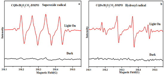 To further confirm the generation of ·O2− and ·OH species, the ESR spin-trap measurement based on CQDs/Bi2O2CO3 photocatalysts under dark and visible light irradiation was conducted. DMPO (5, 5-dimethyl-1-pyrroline N-oxide), a nitrone spin trapping reagent, was utilized to capture the superoxide (·O2−) and hydroxyl radicals (·OH). As shown in Figure 7a,b, negligible ESR signals were observed under dark conditions. However, the four-line characteristic ESR signal for DMPO-·O2−, a signal for the DMPO-·OH spin adduct were found under visible light irradiation. Furthermore, in the ESR spectra of DMPO-·OH for CQDs/Bi2O2CO3, four sets of antisymmetric peaks with intensities of 1:2:2:1 were observed, which are the characteristic signals of DMPO-·OH adducts. ESR demonstrates that ·O2− and ·OH are the main active species of CQDs/Bi2O2CO3 in the photocatalytic degradation process under visible light illumination.