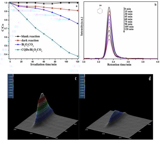 (a) The photocatalytic activity comparison of phenol degradation; (b) HPLC chromatograms of phenol solutions with CQDs/Bi2O2CO3 photocatalyst; (c,d) 3D HPLC spectra of phenol degradation at 0 min and at 120 min.