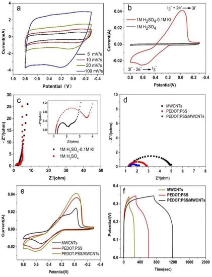 - Zhang, H.; Li, J.; Gu, C.; Yao, M.; Yang, B.; Lu, P.; Ma, Y. High performance, flexible, poly(3,4-ethylenedioxythiophene) supercapacitors achieved by doping redox mediators in organogel electrolytes. J. Power Sources 2016, 332, 413–419. [Google Scholar] [CrossRef]