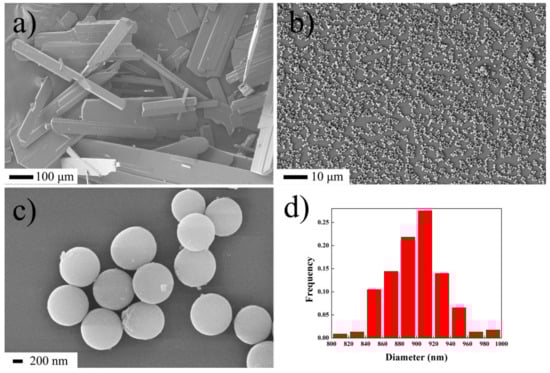 The morphologies of raw HNS and as-prepared nanoenergetic derivative samples based on the optimized conditions [35] are shown in Figure 2. Raw HNS exhibited bulk shapes with an irregular size ranging from micro-scale to millimeter-scale (Figure 2a). However, piperazine cannot be observed because of the hygroscopicity of CO2 and H2O. The samples shown in Figure 2b,c are produced by the reaction of HNS and piperazine in acetonitrile solution. From Figure 2b, it can be seen that the nanoparticles replaced the bulk materials. These nanoparticles were dispersed randomly without aggregation on the surface of the silicon chip, which indicates the good monodispersity of nanoparticles. By the use of local magnification in Figure 2c, it can be seen that almost all the particles have a highly regular spherical shape. The particle size distribution was counted by collecting the diameter of 200 targets from SEM data, as showed in Figure 2d. The average diameter of nanoparticles ranged from 800 nm to 1000 nm with an average diameter of about 900 nm. Also, most of the nanoparticles were highly uniform spheres with a relative standard deviation below 5%, that is, the nanosphere diameter ranged from 850 nm to 950 nm. To the best of our knowledge, despite recent progress in the synthesis of uniform nanospheres in the materials field, micro- or nanospheres in energetic materials usually show a serious nanoparticle aggregation, a relatively broad (above 5%) size distribution or yield irregular, non-spherical shapes. This current work is significant because it reports demonstrated highly regular spherical nanoenergetic materials with high monodispersion and a narrow particle size distribution with a relative standard deviation below 5%.