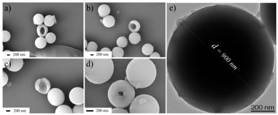 In order to directly describe the inner structure of nanoenergetic spherical derivatives, a small amount of broken spherical nanoparticles which were ground slightly in the deionized water can be observed in Figure 3a–d. The broken nanoparticles which were squeezed and sheared randomly, provide clear evidence of the inner hollow structure and the shell wall thickness of the damaged spherical nanoparticles, which is up to 100 nm (Figure 3c). Then, a spherical nanoparticle with a diameter of 900 nm was characterized by TEM (shown in Figure 3e). Some differences existed in the contrast ratio when comparing the surrounding margins with the middle parts of the spherical nanoparticles. However, due to their thicker shells (above 100 nm), the TEM image of spherical nanoparticles cannot provide direct evidence to effectively illustrate their inner structure.
