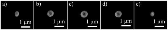 Furthermore, synchrotron radiation X-ray imaging technology analysis was utilized to investigate the inner structure of spherical nanoparticles. A group of synchrotron radiation X-ray imaging technology images of spherical nanoenergetic derivatives are collected in Figure 4 to demonstrate the inner structure of the nanoenergetic spherical nanoparticles by randomly testing single samples. Synchrotron radiation X-ray imaging technology is a new nano-CT technology with higher resolution. By scanning the different regions, a series of tomographical information can be obtained as shown by the group of images in Figure 4. With this information, it was possible to compare the intermediate section (Figure 4c) with the beginning or end section (Figure 4a or Figure 4e, respectively) and verify the differences in the inner hollow structures of nanoparticles.