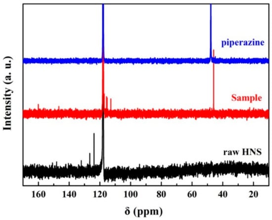 In the 13C NMR patterns shown in Figure 5, raw HNS, piperazine and nanoenergetic derivatives were investigated. Considering that many reaction products have poor solution ability in reagents, acetonitrile-d2 with relatively good solubility was chosen as a deuterium reagent for NMR tests. From the results, the 13C NMR spectrum of nanoenergetic derivatives showed resonance peaks from aromatic carbons ranging from 170 ppm to 110 ppm and piperazine carbon at 45.7 ppm, suggesting that the products were synthesized from the reaction of HNS and piperazine. Compared to HNS, the resonance peaks of the nanoenergetic derivatives have shifted although the benzene skeleton structure remains stable. For piperazine segments of nanoenergetic derivatives, four piperazine carbon atoms have only one resonance peak shift from raw piperazine (the resonance peak at 48 ppm), indicating that these carbon atoms are in the same chemical environment. Many complex chemical reactions for nitro-aromatic compounds are involved in alkaline environments: HNS is a typical nitro-aromatic compound and piperazine is an alkaline substance [36]. Under this reaction condition, the piperazine radicals are formed easily because of the properties of organic alkaline substances. As alkaline active sites, piperazine radicals attacked C=C bonds, which are regarded as weak points in the chemical structure of HNS. More interestingly, the piperazine radical with two active sites can induce the main cross-linking chain reactions with C=C bonds via free radical copolymerization reaction, indicating that HNS-piperazine derived oligomers may be formed in the end.