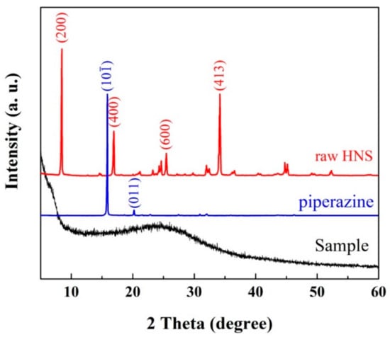 Figure 6 shows the XRD patterns of as-prepared samples. For raw materials, the red pattern demonstrated that the main diffraction peaks at the degrees of 8.4, 16.9, 25.4, and 34.1 corresponded to the (200), (400), (600) and (413) plane, respectively, of the HNS crystal, and also overlapped with data from JCPDS card No. 00-042-1919. Also, the XRD pattern of piperazine showed that the two main diffraction peaks at the degrees of 15.9 and 20.2 corresponded to the (10) and (011) plane of the piperazine crystal. However, compared with highly-crystalline raw materials, the low-level crystalline demonstrated the nanoenergetic derivatives attributes of amorphous material, which could indirectly prove that the reaction products were HNS-derived oligomers.