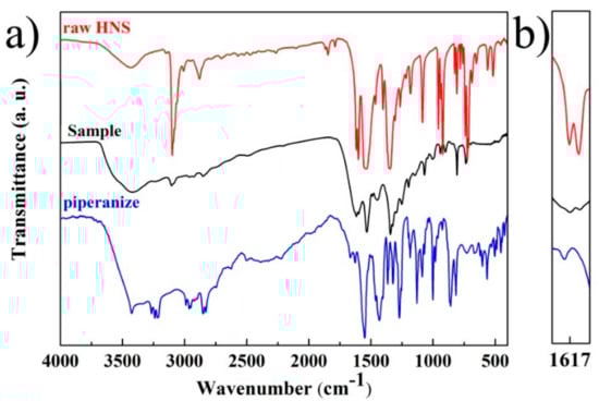 Furthermore, the as-prepared samples were studied by FT-IR, as shown in Figure 7. The distinct peaks of raw HNS are as follows [34]: 3098 cm−1 (aromatic C–H stretching), 2880 cm−1 (alkenic C–H str), 1618 cm−1 (aromatic C=C str), 1600 cm−1 (alkenic C=C str), 1540 cm−1 (NO2 asymmetric str), 1345 cm−1 (NO2 symmetric str), and so on. The distinct peaks of piperazine are as follows: 922 cm−1 (ring skeleton str), 1430 cm−1 (–CH2– bending vibrations), and so on. For the FT-IR spectrum of reaction products, the absorption peaks at 1617 cm−1, 1599 cm−1, 1532 cm−1 and 1340 cm−1, as well as 1448 cm−1, 940 cm−1 demonstrated that the main functional groups, such as the aromatic ring skeleton, nitro groups and piperanize ring skeleton and its –CH2– unit, have remained. Compared with raw HNS (shown in Figure 7b), the relative intensity of absorption peaks between aromatic C=C bonds (1617 cm−1) and alkenic C=C bonds (1599 cm−1) underwent a remarkable change and this indicated that raw HNS participated in the reaction with piperazine radicals mainly through C=C bonds [37,38]. This is in accordance with the 13C NMR results. However, the intensity of alkenic C=C bonds (1599 cm−1) absorption decreased but remained, which suggested that side reaction pathways for HNS also existed in the mixed system.