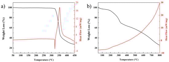 The thermal performances of the samples were investigated by thermogravimetric-differential scanning calorimetry (TG-DSC) measurement, as shown in Figure 8. For the pure HNS crystal in Figure 8a, the high thermal stability of the pure HNS (the initial thermal decomposition temperature is 332 °C) is shown, which originates from the rich intramolecular and intermolecular interactions, especially the hydrogen bonding. However, nanoenergetic HNS derivatives exhibited attractive and interesting thermal properties based on their thermal decomposition. Compared to the thermostable explosive HNS, a continuous thermal decomposition process was discovered, shown in Figure 8b, which was in agreement with thermal decomposition of polymer or oligomer materials [39,40]. Slow thermal decomposition occurred in the full range from 50 °C to 800 °C with the release of heat. During this process, the mass loss of sample is about 80%. Although the thermal stability of nanoenergetic derived material is relatively unsatisfactory, its unique decomposition action and slow energy release process may provide new application prospects in particular environments.