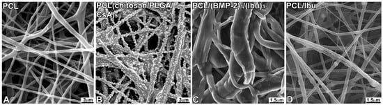 Scanning electron microscopy (SEM) observations of non-functionalized PCL scaffolds consisting of non-woven electrospun nanofibers (A), PCL scaffolds grafted with CsA-loaded PLGA nanoparticles (chitosan/PLGA/CsA)5 (B), with BMP-2/Ibuprofen (PCL/(BMP-2)3/(Ibu)3) nanoreservoirs (C) or with Ibuprofen (D). For the morphological study by SEM, the different scaffolds were fixed with 4% paraformaldehyde, dehydrated in successive baths of ethanol (25, 50, 75, 90, 100%) and treated with hexamethyldisilazane (HDMS). They were mounted on a supporting sample holder using carbon conductive adhesive, then, silver-coated and observed with a Philips XL-30 ESEM scanning electron microscope in conventional mode (high vacuum) with a Everhart-Thornley secondary electron detector.