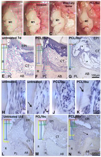 Periodontitis induced with Porphyromonas gingivalis-infected ligatures and treatment with PCL/Ibu membrane (A–D). (B) sulcular incision along the first and second maxillary molars, (C) raising the flaps for exposure and access, (D) surgical placement of PCL/Ibu membrane on the periodontal lesion, (E–N) histological view at 7 and 15 days. (E–K) histology of periodontal wound healing at 7 days and (L–N) at 15 days. Red line = cementoenamel junction, blue line = fibrous connective tissue attachment, green line = epithelial attachment, yellow line = bone level. After anesthesia, a slight incision to the bone crest contact was made to facilitate the first ligature placement at the junction between the gum and the tooth along the first and second molars (M1-M2) as previously described [16]. The thread was then blocked with a drop of glass ionomer (Fuji IIGC, GC, France, Bonneuil sur Marne, France). Sterilized black braided 6.0 silk threads (Ethicon, Auneau, France) were incubated in culture medium containing P.gingivalis in an anaerobic chamber for one day. P.gingivalis-soaked ligatures were placed around maxillary first and second molars. The ligatures were inspected and replaced (with freshly infected ones) thrice a week for a period of 40 days. An incision was performed along the sulcular margins of the first and second molars and extended anteriorly on the mesial aspect of the first molar to efficiently raise the flap to gain access. Ibuprofen-functionalized PCL membrane was punched with a 3 mm diameter cutter. The circular pieces of membrane were further divided into half to achieve a size appropriate enough to cover the lesion. The cut membrane was then placed into the periodontal pocket after raising the flap such that the membrane stays flat beneath the flap covering the lesion fully and the necks of the crowns (molars) partially, entering the inter-dental area as well. The flap was nicely repositioned to perform a suture on the flap while maintaining the membrane underneath [16]. AB: alveolar bone, CT: connective tissue, EPI: epithelium, PL: periodontal ligament, R: root. Stars showing PCL/Ibu membrane.