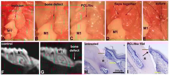Surgical bone defect model and treatment with PCL/Ibu membrane (A–I). (A–E) demonstrate the surgical procedure for creating the mesial bone defect. After anesthesia, sulcular incision (A) was given along maxillary first molar and extended anteriorly on the mesial aspect of the first molar for efficient raising of palatal and vestibular flaps so that they do not hinder the bone drilling procedure. The exposed bone was drilled to create the intrabony defect (B). The bone over and around the mesial root of the first molar was removed. Constant irrigation with physiological saline was maintained to avoid overheating of the bur and the bone area concerned. The drilled bone was, later, nicely irrigated, cleaned, and dried to remove all the bone chips and debris. PCL/Ibu functionalized membrane was placed on the created bone lesion (C) in such a manner that its ends could be blocked beneath the vestibular and palatal flaps. Palatal and vestibular flaps were approximated covering the PCL/Ibu membrane underneath and sutured (9-0 ETHILON* Polyamide 6/6) or glued to retain the membrane underneath (D,E). (F) micro-CT view before the bony defect and (G) after bony defect. (H,I) Histology of periodontal wound healing at 15 days. Red line = cementoenamel junction, yellow line = bone level. (I) Arrow showing short epithelial attachment in test. M1: first upper molar, R: root.