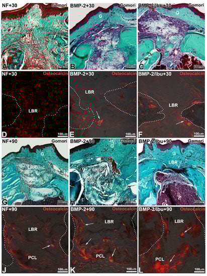 Trichrome of Gomori staining (A–C,G–I) and immunofluorescence for osteocalcin (D–F,J–L) after 30 (A–F) and 90 days (G–L) implantation of PCL (A,D,G,J), PCL/(BMP-2)10 (B,E,H,K) and PCL/(BMP-2)10/(Ibu)3 (C,F,I,L). Arrows indicated neoformed bone positive for osteocalcin. White dots indicate the limit of the maxillary bone. For the immunofluorescence, samples were embedded in Tissue-Tek, frozen at −20 °C and sectioned (10 μm) using a cryostat (Leica, CM3000). Serial sections were rinsed with PBS, fixed for 10 min with 4% paraformaldehyde at 4 °C and treated as previously described [27] using the rabbit anti-osteocalcin antibodies (Santa Cruz Biotechnology, dilution 1/200). Sections were observed with a fluorescence microscope (Leica DM4000B). G: gingiva, LBR: lesion with bone regeneration, PCL: scaffold.