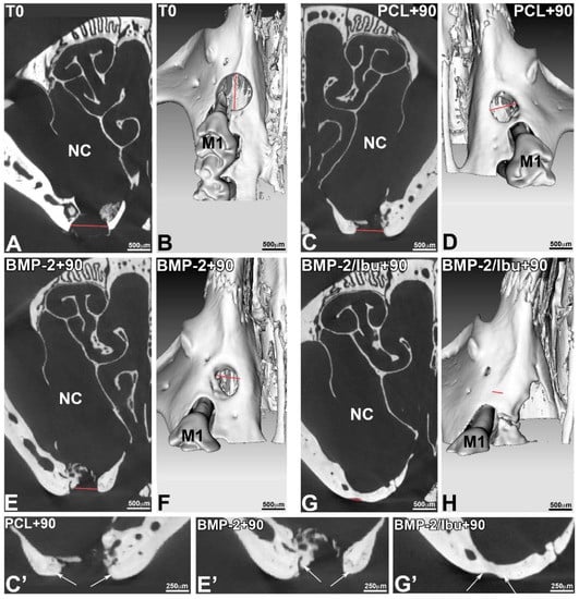 Micro-CT sections (A,C,E,G,C’,E’,G’) and 3D reconstructions (B,D,F,H) at T0 (A,B) and after 90 days of implantation of PCL (C,D,C’), PCL/BMP-2 (E,F,E’), and PCL/BMP-2/Ibu (G,H,G’). To study the evolution of bone response, we conducted an ex vivo longitudinal post-operative follow-up using micro-CT. The X-ray microtomography acquisitions were performed after 0 and 90 days. The size of the reconstructed isotropic voxel was 8 μm. M1: first upper molar, NC: nasal cavity.