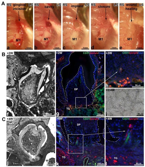 An incision was made up to the bone contact at the top of the alveolar crest in diastemal area, in front of the M1 (Figure 6(Aa)). The bone lesion was obtained using a round bur (diameter 0.8 mm) (Figure 6(Ab)). Then, the cultured germ associated with a TG on the CsA biomembrane was implanted (Figure 6(Ac)) and the lesion was closed with a biological glue (Figure 6(Ad)), which allowed to cover the whole surgical site and promoted the wound healing. Two weeks after implantation, the mucosa was macroscopically and histologically closed (Figure 6(Ae)). Samples were recovered after two and four weeks of implantation (Figure 6B,C). Well-formed teeth were developed in the maxillary bone. The crown presented a normal morphogenesis with several cusps (Figure 6(Bf)) and the root formation was initiated after two weeks (Figure 6Bf) and further developed after four weeks (Figure 6(Cj)). Odontoblasts and ameloblasts were functional, they secreted predentin/dentin and enamel organic matrix, respectively (Figure 6(Bf),(Cj)). The PCL membrane was detected in contact with the bioengineered tooth (Figure 6(Bi)). Indirect immunofluorescence analysis two weeks after implantation revealed the presence of blood vessels positive for CD31 (Figure 6(Bg)) in the dental pulp and some nervous filaments positive for peripherin at the base of the tooth (Figure 6(Bh)). Four weeks following implantation, nerve fibers penetrated the dental pulp in the most apical region (Figure 6(Ck),(Cl)). In both cases, nerve fibers were associated with the blood vessels. After implantation with control PCL membranes ((chitosan/PLGA)5), bioengineered teeth were vascularized but not innervated (not shown) [22].