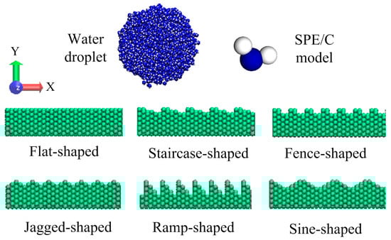 - Chen, J.; Chen, W.; Xie, Y.; Wang, Z.; Qin, J. Wettability behavior of water droplet on organic-polluted fused quartz surfaces of pillar-type nanostructures applying molecular dynamics simulation. Appl. Surf. Sci. 2017, 396, 1058–1066. [Google Scholar] [CrossRef]