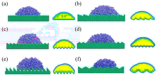 The snapshots in equilibrium state and time-averaged density profiles of nano-droplet on substrate with (a) flat-shaped, (b) staircase-shaped, (c) fence-shaped, (d) jagged-shaped, (e) ramp-shaped and (f) sine-shaped rough surface
