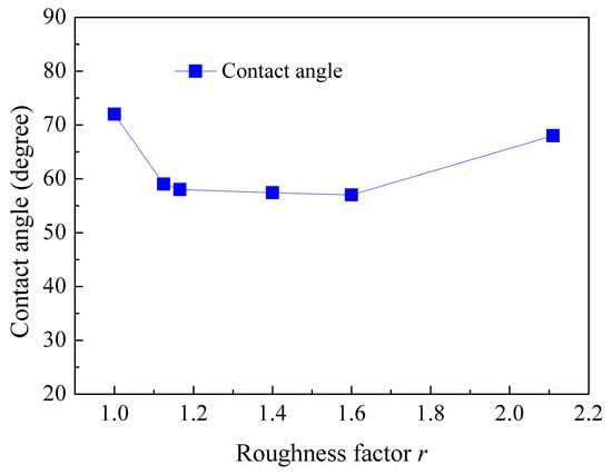 Firstly, to check the simulation model, the static contact angle of water nano-droplet on flat silicon surface (r = 1.00) in the absence of electric field is calculated. The result shows that it is 72 ± 0.5 degree and consistent with the experimental data from literature [35,36]. The snapshots in equilibrium state and time-averaged density profiles of water nano-droplet on rough solid surface (E = 0.0 V/nm) are shown in Figure 2. It can be seen that water molecules accumulate at the depressions and bulges of the rough surface due to the strong attraction from silicon atoms on the rough area and result in the density near the rough area on the surface being slightly higher than that in the inner droplet. Figure 3 depicts the distribution of the contour line of the water droplet on different rough substrates and the corresponding static contact angles with the increase in roughness factor. The static contact angle is obtained by fitting the droplet contour using the elliptical equation. Clearly, the droplet is in the Wenzel state, except for the case of wetting on the ramp-shaped surface. The static contact angle decreases slightly and shows a small difference with the increase in roughness factor due to the different shape of the roughness. When the nano-droplet wets the ramp-shaped surface (r = 2.11), the droplet is in the Cassie-Baxter state and the corresponding contact angle tends to increase. The microscopic mechanism of the wetting of the nano-droplet on the rough surface is the molecular interaction between water molecules and silicon atoms. When the roughness factor increases, the real contact area between droplet and solid becomes bigger leading to a stronger attraction from the solid substrate and thus the contact angle tends to decrease. Meanwhile, when the solid surface is constructed in a ramp shape, molecules accumulate on the depression area before overcoming the rough barrier, accompanied by a small interspace appearing at the bottom. So, the real contact area is smaller than the true surface area and then the surface wettability is reduced with a slight increase of contact angle in this case.