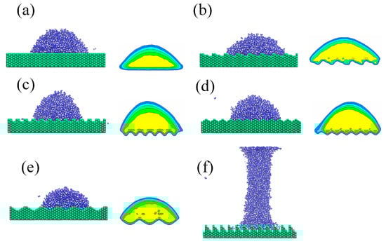 Snapshots and time-averaged density distributions of water nano-droplet in equilibrium state on silicon substrate with (a) flat-shaped, (b) staircase-shaped, (c) fence-shaped, (d) jagged-shaped, (e) sine-shaped and (f) ramp-shaped rough surface (Ey = 0.9 V/nm)