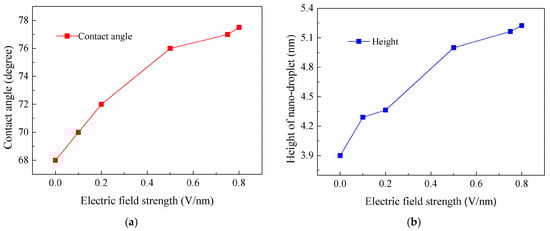 (a) Equilibrium contact angle and (b) the height of water nano-droplet on silicon substrate (ramp-shaped surface) under different electric fields.