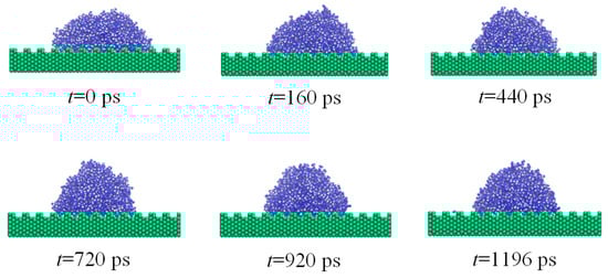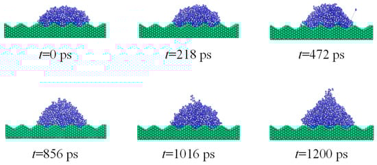 To further understand the electro-wetting phenomenon of the droplet on the rough solid substrate, the dynamic spreading of a water nano-droplet on a solid substrate with fence-shaped and sine-shaped surfaces are investigated under electric field Ey = 0.9 V/nm and Ey = 1.0 V/nm, respectively. For the fence-shaped substrate, the dynamic wetting, as depicted by several snapshots at different instants of time, is shown in Figure 7 (Ey = 0.9 V/nm). For the sine-shaped substrate, the dynamic wetting of the nano-droplet is given in Figure 8 (Ey = 1.0 V/nm). In addition, the evolution of the dynamic contact angles over time for both rough solid substrates is plotted in Figure 9.
