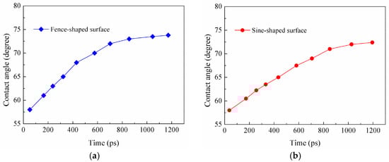 Dynamic contact angles of water nanodroplet on rough silicon substrate under electric field; (a) For fence-shaped surface Ey = 0.9 V/nm; (b) For sine-shaped surface Ey = 1.0 V/nm.
