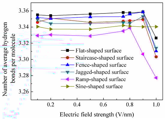 Theoretically, the maximum number of hydrogen bonds per water molecule is 4.0. At nanoscale, since the specific surface area increases, the number of hydrogen bonds per molecule will decrease and generally is less than 4.0. Figure 10 depicts the average number of hydrogen bonds per water molecule under different electric fields. It could be seen that the average number of hydrogen bonds for the droplet on a specified surface almost stays the same with the increase of the electric field strength before the kick point. This is consistent with the result in the literature [15], in which the number of hydrogen bonds shows a distinct oscillation under different electric fields. As mentioned above, the direction of the dipole tends to follow the direction of the electric field. They are distributed randomly and disorderly when the electric field is smaller than 0.8 V/nm and thus the number of hydrogen bonds is almost unchanged. However, when the electric field exceeds a threshold value, the average number of hydrogen bonds decreases sharply. This is because the electric field strength is strong enough that the disordered dipole distribution becomes ordered and the hydrogen bond nets are destroyed. As a result, the average number of hydrogen bonds decreases rapidly. The average number of hydrogen bonds is largest when a droplet wets a flat silicon surface and smallest on a ramp-shaped surface. This confirms that the shape of the roughness could affect the distribution and arrangement of water molecules and thus has influence on the number of hydrogen bonds per molecule. So, both the electric field and surface roughness have an effect on the distribution of water molecules and the formation of hydrogen bonds.