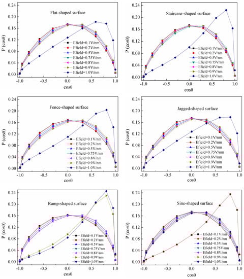 Water molecules have a tendency to self-arrange under the influence of an external electric field. Near the solid-liquid interface, the movement of water molecules is determined by the competition between the external electric field force, solid-liquid intermolecular forces and liquid-liquid intermolecular forces. In particular, the roughness of the solid surface makes the competition mechanism more complex. From the simulation data, the average polarization of water molecules along the direction perpendicular to the surface is calculated and the results are shown in Figure 11, where θ is the angle between the dipole moment vector of water molecules and the y-axis (y+). It was found that water molecules are in a disordered structure with water orientation distributions symmetric and broad at weak electric field E < Ec. Here, Ec is the characteristic electric field and it is about 0.8 V/nm, being consistent with the literature [15]. When the electric field strength increases up to 0.9 V/nm, half the water dipoles in the case of the ramp-shaped surface exhibit an angle smaller than 30 degrees, while in the other cases, water dipoles were still distributed randomly, indicating that the restriction from ramp-shaped surface is smaller than others. When the applied electric field strength increases to Ey = 1.0 V/nm, external electric field force is greater than the other intermolecular forces. Electric field force plays a more decisive role in the rearrangement of water molecules, with 50% or more water dipoles exhibiting a preferential orientation parallel to the direction of the electric field, which contributes to the formation of an ordered water structure. Accordingly, the electro-wetting behavior of a water droplet on a solid substrate is controlled by a coupling effect among water, solid intermolecular forces and the electric field.