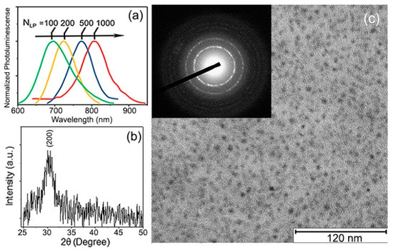 (a) Initial photoluminescence (PL) spectra of PLD-deposited PbS QDs with different number of laser shots (NLP). PL of the PbS QDs shows clearly red shift from 680 to 820 nm. This obvious shift is a consequence of the quantum size effects of the PbS QDs [16]; (b) XRD pattern of PbS QDs deposited with NLP = 500; (c) TEM image of PbS QDs deposited directly onto carbon-filmed-grids; the inset in (c) is their TEM diffraction pattern.
