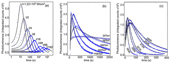 Time evolution of the photoluminescence integrated intensity for the PbS QDs, under three distinct experimental conditions: (a) Variation over laser power with 1 atmosphere of oxygen pressure and constant temperature (294 K), (b) variation under different oxygen pressures at room temperature and 1.54 × 104 W/cm2 light intensity, and (c) temperature effect at constant pressure (1 atmosphere) and same constant laser power. Solid lines are fit to the physical model described in the text.