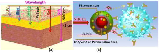 (a) Schematic illustration of the penetration depth of different wavelengths in a tissue model; (b) Upconverison nanoparticle as a frequency conversion nanotransducer to convert the NIR excitation to visible emission for activation of the photosensitizer, producing reactive singlet molecular oxygen that destroys diseased sites.