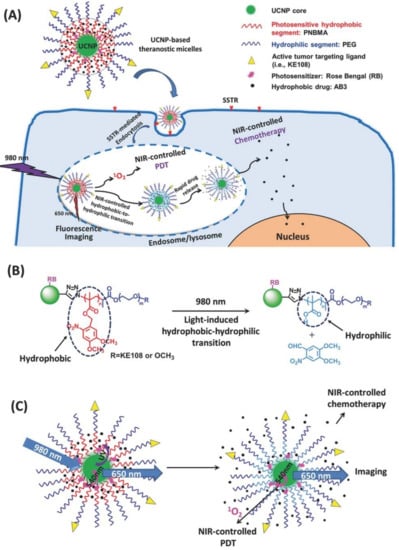 (A) A UCNP-based theranostic micelle for simultaneous NIR-controlled combination chemotherapy and PDT, as well as fluorescence imaging; (B) An illustration of NIR-triggered hydrophobic-to-hydrophilic transition; (C) An illustration of NIR-controlled combination of chemotherapy and PDT, as well as fluorescence imaging. Reproduced with permission from [69]. Copyright Wiley-VCH, 2017.