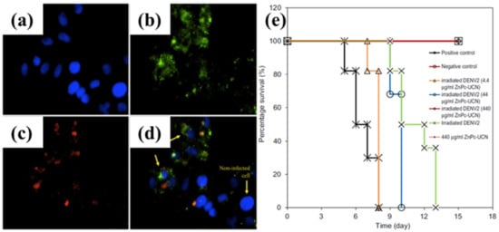 (a–d) cells were added with anti-DENV2 envelope protein antibody-conjugated ZnPc-UCNPs. Blue fluorescence in (a) showed DAPI-stained cell nuclei. Green fluorescence in (b) showed FITC-staining of DENV2-infected cells. Red fluorescence in (c) showed the location of antibody-conjugated ZnPc-UCNs. (d) Kaplan-Meier survival curve of day 1-2 BALB/c suckling mice that were inoculated with photodynamic-inactivated DENV2. The results showed that the UCN-based PDT system can eradicate Dengue virus pathogenesis in BALB/c mice. Reproduced with permission from [50]. Copyright Elsevier, 2012.