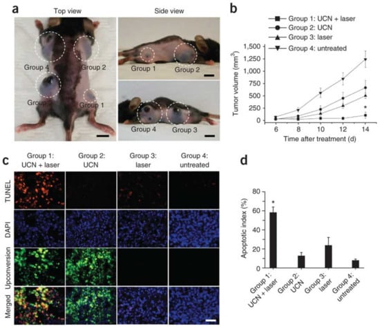 In vivo PDT of injected tumor cells prelabeled with mesoporous-silica–coated UCNPs co-loaded with ZnPc and MC540 photosensitizers. (Excitation by a single wavelength light at 980 nm) (a) Representative photos of a mouse showing tumors (highlighted by dashed white circles) at 14 d after treatment with the conditions described for groups 1–4. Scale bars, 10 mm; (b) Tumor volumes in the four treatment groups at 6, 8, 10, 12, and 14 d after treatment to determine the effectiveness of the treatment in terms of tumor cell growth inhibition; (c) TUNEL staining of tissue sections from the treatment groups at 24 h after treatment to determine the effectiveness of the treatment in terms of tumor cell death by apoptosis. DAPI counterstaining indicates the nuclear region, and upconversion fluorescence imaging indicates the position of the injected UCN-labeled cell (×400 magnification). Scale bar, 20 μm; (d) The apoptotic index charted as the percentage of TUNEL-positive apoptotic nuclei divided by the total number of nuclei visualized by counterstaining with DAPI obtained from counts of randomly chosen microscopic fields. Reproduced with permission from [45]. Copyright Nature Publishing Group, 2012.