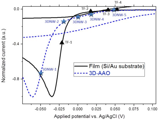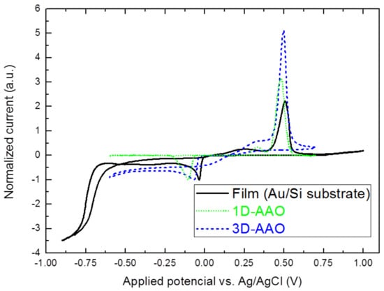 15]. If we compare the cyclic voltammetry (CV) obtained with the one obtained when a gold layer over a silicon substrate is used as working electrode (which shows a reduction peak around −35 mV applied potential vs. Ag/AgCl), and with that recorded when a 1D-AAO membrane is used as the working electrode; we can see from