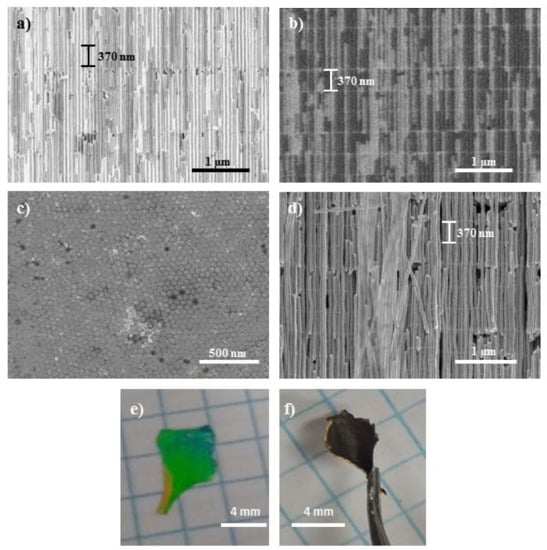 Figure 5e,f show images of the macroscopic structure before (e) and after (f) removal of the 3D–AAO. There it can be seen that the 3D Bi