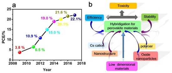 Perovskite solar cells (PSCs) have attracted immense research attention. They show unique properties such as a direct band gap, high absorption coefficient, and long carrier diffusion lengths [1,2]. The physical properties of the hybrid perovskites that are used in photo voltaic devices have been extensively studied, and are reviewed by Huang et al. in ref. [3]. Since the first report on dye-sensitized solar cells using a perovskite as the dye with an efficiency of 3.8% was published in 2009 [4], there has been a rapid increase in the number of publications in this area, as well as a rapid increase in the reported efficiencies. The evolution of the highest power conversion efficiencie (PCE) reported for PSCs over the years is depicted in Figure 1a [4,5,6,7,8,9,10,11]. A PCE of 22.1% was recently reached by Yang et al. [5]. Up to now, the highest reported efficiency of a perovskite solar cell was recorded at 22.7% by the National Renewable Energy Laboratory (NREL) [12]. The material used was an inorganic-organic hybrid material with a perovskite (ABX3) structure (A: methylammonium (CH3NH3+, MA), formamidinium (HC(NH2)2+, FA), Cs, Rb; B = Pb, Sn; X = halogen anion (Cl, Br and I), (SCN−)) [13,14,15,16,17]. Despite rapid developments in the performance of perovskite solar cells, there have been concerns about several issues such as the photocurrent hysteresis, device stability, and scaling issues that are able to affect the measurement accuracy and/or practical applications of these devices. In addition, there are possible environmental effects related to the use of lead-based perovskite materials [18,19,20].