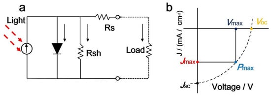 The detailed principles of solar cells have been explained by Nelson et al. in ref. [60]. In brief, the equivalent circuit diagram of a solar cell is displayed in Figure 4a. The equivalent circuit parameters are the series resistance, shunt resistance, and load [61]. When light is irradiating the device (Figure 4b), the voltage across the device is biased with the load. Therefore, the characteristics of perovskite solar cells are determined by measuring the current density. The PCE is evaluated from the short-circuit density (Jsc) and the open-circuit voltage (Voc) using the following equation [62]: , where Pmax and FF are the incident power from the solar irradiation and fill factor, respectively. The value of the FF is the ratio of Pmax (JmaxVmax) to the product of Jsc and Voc. It should be noted that these important parameters have provided great guidance for evaluating PSCs [63].