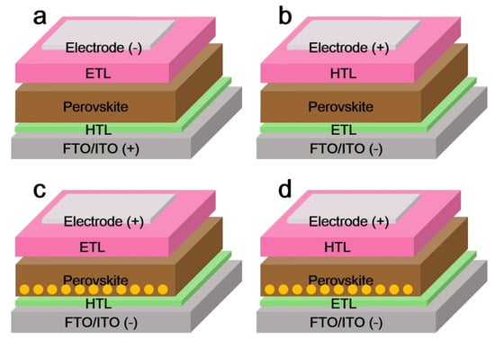 Structures of (a) inverted (p-i-n) and (b) normal planar structure (n-i-p) perovskite solar cells, (c) mesoporous structured (c) inverted (p-i-n) and (d) normal planar structure (n-i-p) perovskite solar cells. ETL and HTL represent the electron transport layer and hole transport layer, respectively.