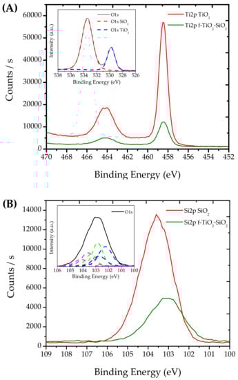 To understand the functionalization effect and the interaction between the TiO2 and SiO2 nanoparticles with TMPTA, the systems were analyzed by means of XPS. As shown in Figure 1, the Ti2p spectra (Figure 1A) of TiO2 showed the Ti2p3/2 signal with a binding energy at 458.5 eV and a Ti2p3/2–Ti2p1/2 separation of 5.74 eV; these spectra were in agreement with those for TiO2 pristine nanoparticles [19]. The Ti2p spectra for f-TiO2–SiO2 decreased in intensity and became broader; the Ti2p3/2 full width at half maximum (FWHM) increased from 1 to 1.23 eV, and the peak shape changed for the functionalization effect. The mathematical analysis of the signal corresponding to O1s of the f-TiO2–SiO2 sample could be adjusted with two different signals (Figure 1A inset), the first at 529.8 eV, and the second at 533.5 eV. The signal at 529.8 eV corresponded to O1s of TiO2 nanoparticles, and the signal at 533.5 eV was attributed to oxygen of the SiO2 nanoparticles. Furthermore, the Si2p spectra (Figure 1B) showed a signal at a binding energy of 103.6 eV; as did the Si2p spectra of nanoparticles obtained after functionalization, for which a broadening of the signal was observed, changing the FWHM from 1.93 to 2.14 eV as well as changing the peak position and shape. The peak could be analyzed using three doublet signals (Figure 1B inset), one at 102.3 and 102.7 eV for Si–Ti bonding, another at 102.9 and 103.4 eV for Si–C bonding, and another at 103.6 and 104.1 eV that was attributed to Si–O [20]. From this, we can infer that functionalization took place on the nanoparticle surface.