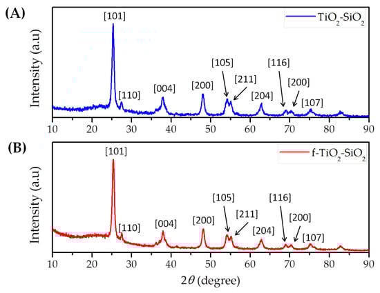 X-ray diffractograms of (A) TiO2–SiO2 and (B) f-TiO2–SiO2 nanoparticles.