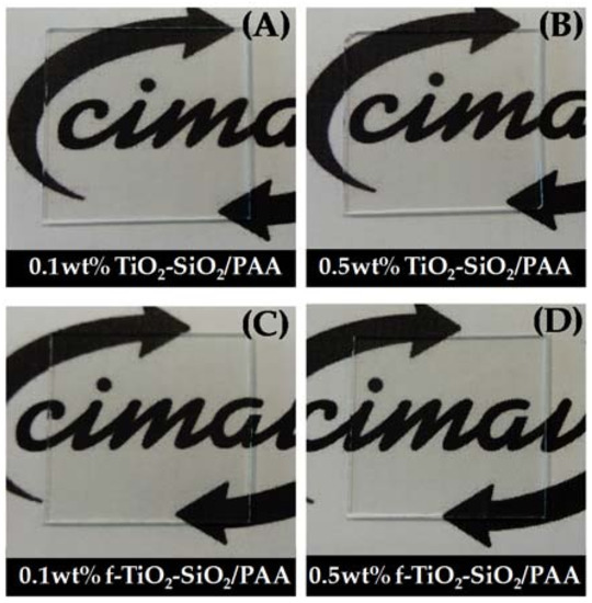 Figure 4 depicts the captions of the nanocomposites coatings. As can be seen in the images, all coatings were highly transparent and homogeneous, lacking the presence of agglomerates on the surface.