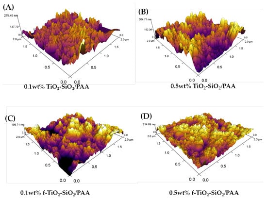 Contact-mode AFM images of 2 µm × 2 µm for all the nanocomposite coatings are shown in Figure 7. The nanocomposite coating of 0.5 wt % f-TiO2–SiO2/PAA (Figure 7D) showed agglomerates, where evidently SiO2 nanoparticles surrounded TiO2 nanoparticles; this behavior was also observed in the nanocomposite coating for 0.1 wt % f-TiO2–SiO2/PAA.