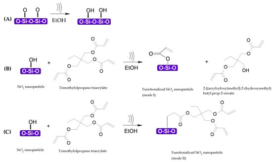 Proposed reaction mechanism for SiO2 nanoparticles functionalized with trimethylolpropane triacrylate (TMPTA) under sonication conditions. (A) hydroxyl groups are attached to SiO2 nanoparticles after the first step, addition of TMPTA results in (B) functionalized SiO2 nanoparticles with an acrylic surface moiety (mode I) and (C) functionalized SiO2 nanoparticles with a vinyl group (mode II).